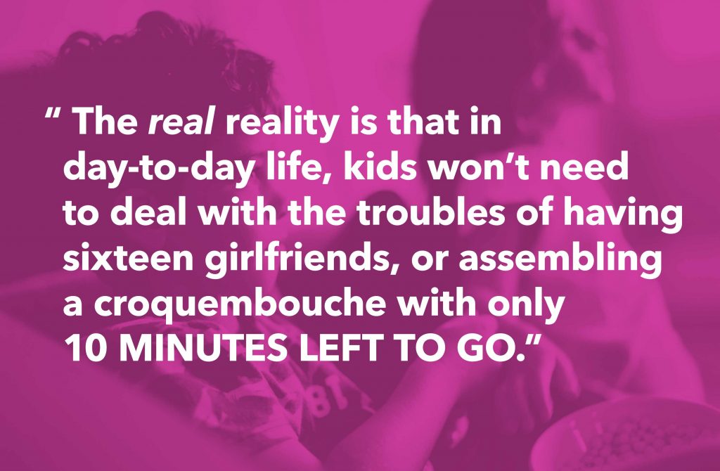 On further reflection, however, I reconsidered Anderson’s original statement. Maybe kids did enjoy these programs, too? Co-viewing with family is something that both kids and adults enjoy. Parents often don’t consider the time spent watching together as “screen time”, but rather more as a “family-time” period. Not to mention, kids are also diverse and multifaceted – they have wide-ranging breadths of interest, and perhaps (like adults), they enjoy reality TV as a form of escapism from every-day life. The real reality is that in day-to-day life, kids won’t need to deal with the troubles of having sixteen girlfriends, or assembling a croquembouche with only 10 MINUTES LEFT TO GO.